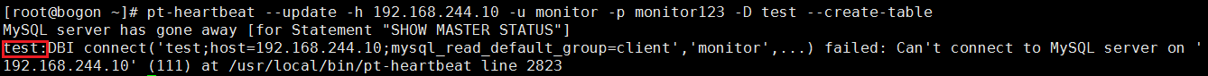 # pt-heartbeat --update -h 192.168.244.10 -u monitor -p monitor123 -D test --create-table