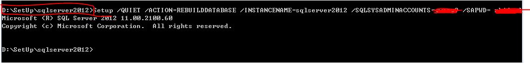 D:/SetUp/sqlserver2012>Setup /QUIET /ACTION=REBUILDDATABASE /INSTANCENAME=sqlserver2012 /SQLSYSADMINACCOUNTS=UserName /SAPWD= ***