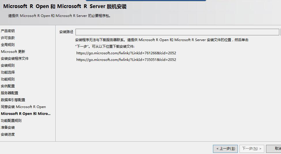 功能選擇里多出來的R Server,但是R Server需要聯網或者自己下載下來,這是坑爹的地方之一,它沒有集成在SQL Server2016安裝包里