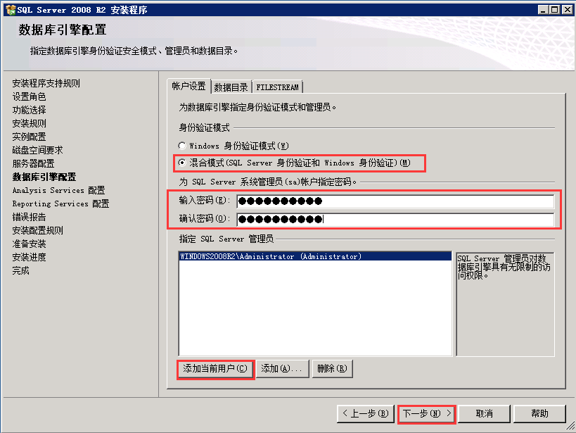 4.1.9數據庫引擎配置,建議選擇混合模式,注:牢記設置的密碼!!!