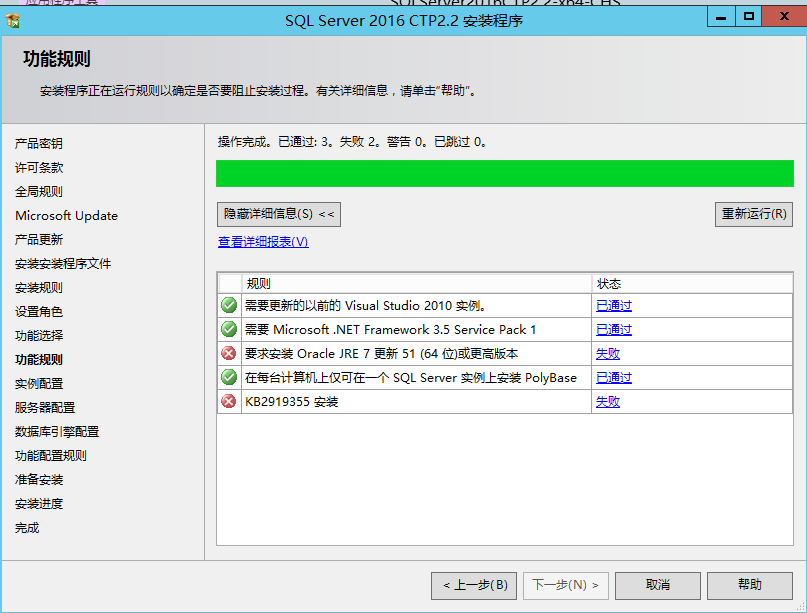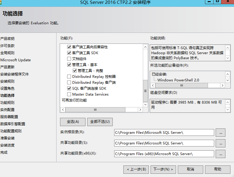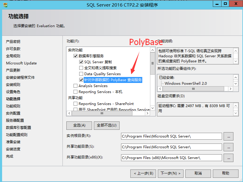 安裝過程中的第一個坑來了,如果你勾選了PolyBase,它是需要安裝JAVA JRE的,因為它需要調用JRE來查詢hadoop數據