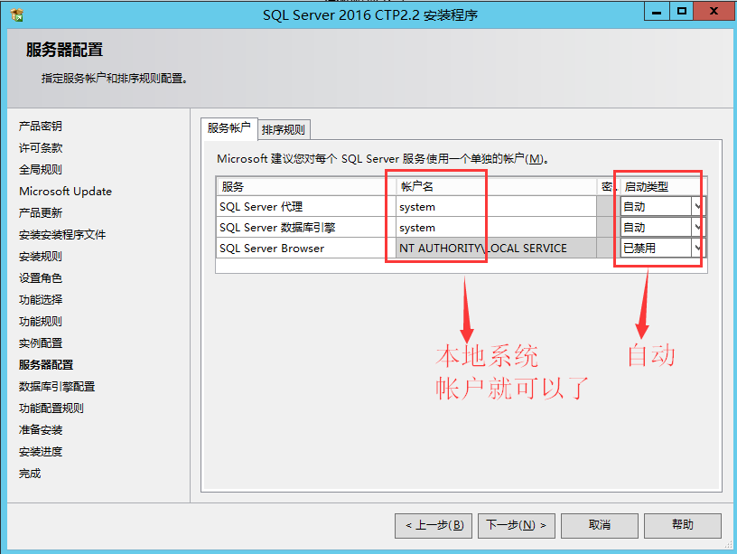 SQL服務和SQL 代理服務的啟動帳戶都使用本地系統帳戶 localsystem,啟動類型為自動