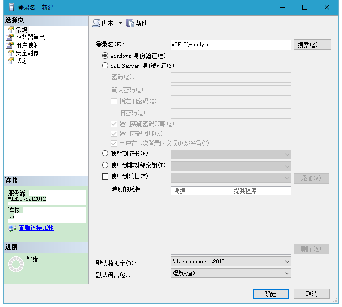 6.回到【登錄名-新建】對話框,設置AdventureWorks2012數據庫作為登錄的默認數據庫。當用戶連接到服務器且不指定數據庫時,這是用戶使用的數據庫。這不限制用戶只訪問那個數據庫。插圖2.4展示對于在WIN10的機器上Windows的登錄用戶woodytu,設置默認數據庫為示例數據庫AdventureWorks2012的登錄配置。