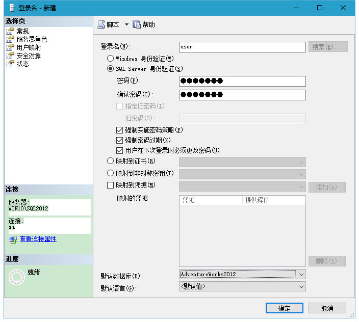 創建SQL Server登錄,使用和Windows登錄同樣的【登錄名-新建】對話框。但不是選擇Windows登錄,輸入沒有域名或機器名的用戶名,并提供密碼。例如,插圖2.7顯示了如何創建一個新的SQL Server登錄user,把AdventureWorks2012作為他的默認數據庫。