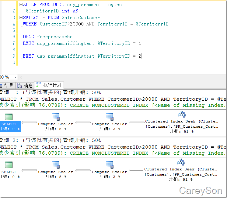 大家可能會(huì)覺(jué)得,這不是挺好的嘛,根據(jù)參數(shù)產(chǎn)生不同的執(zhí)行計(jì)劃。那讓我們?cè)倏紤]一個(gè)問(wèn)題,如果將上面的查詢(xún)放到一個(gè)存儲(chǔ)過(guò)程中,參數(shù)不能被直接嗅探到,當(dāng)?shù)谝粋€(gè)執(zhí)行計(jì)劃被緩存后,第二次執(zhí)行會(huì)復(fù)用第一次的執(zhí)行計(jì)劃!雖然免去了編譯時(shí)間,但不好的執(zhí)行計(jì)劃所消耗的成本會(huì)更高!讓我們來(lái)看這個(gè)例子,如圖4所示。