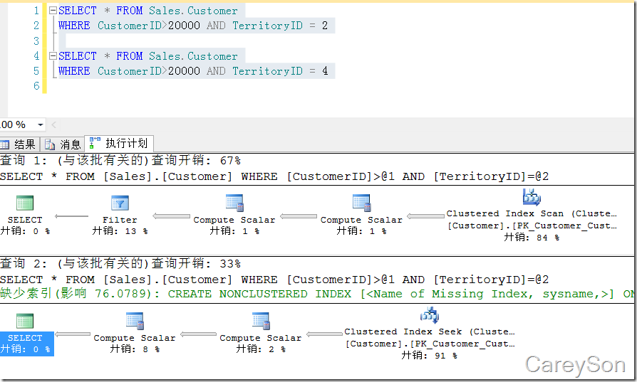 還記得我們之前所說(shuō)的嗎,執(zhí)行計(jì)劃的編譯和選擇分為三步,其中前兩步僅僅根據(jù)查詢(xún)語(yǔ)句和表等對(duì)象的metadata,在執(zhí)行計(jì)劃選擇的階段要重度依賴(lài)于統(tǒng)計(jì)信息,因此同一個(gè)語(yǔ)句僅僅是參數(shù)的不同,查詢(xún)優(yōu)化器就會(huì)產(chǎn)生不同的執(zhí)行計(jì)劃,比如說(shuō)我們來(lái)看一個(gè)簡(jiǎn)單的例子,如圖3所示。