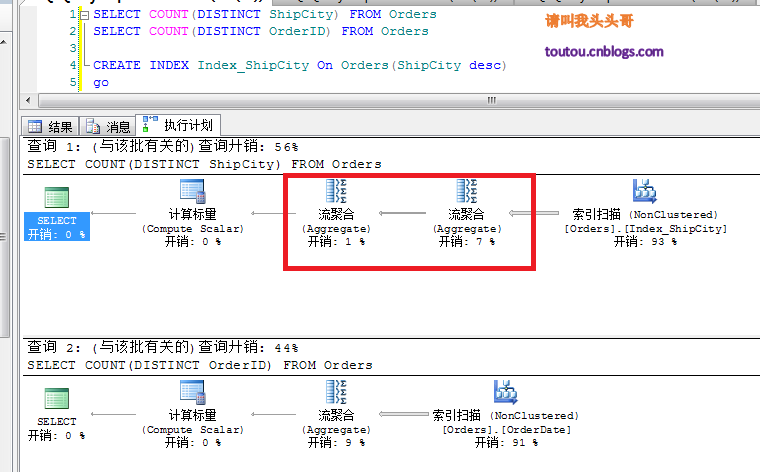 從上圖中可以看到,加了索引以后COUNT(DISTINCT ShipCity)的查詢變成了兩個流聚合,而沒有了排序,節省了開銷。
