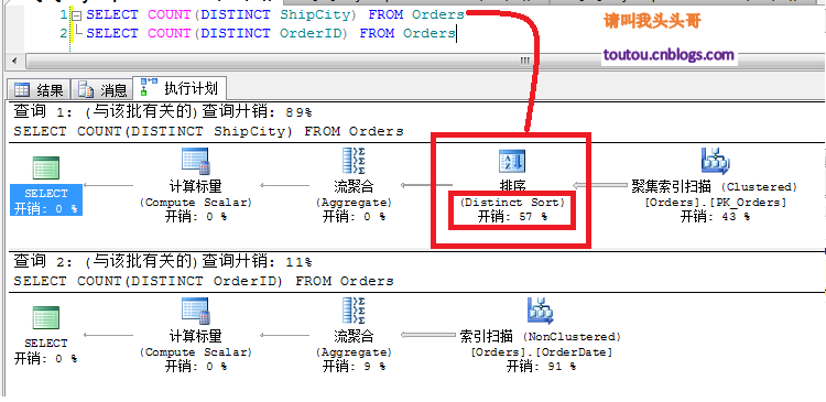 從上圖中可以看到,其實這兩個查詢從語句上來說沒什么太大的區別,但是為什么開銷會不一樣,一個是查詢城市一個是查詢訂單號。這是因為其實DISTINCT對于OrderID查詢來說,是沒有什么意義的,因為OrderID是主鍵,是不會有重復的。而ShipCity是會有重復的,Sql server的去重機制在去重的時候,會有一個排序的過程。這個排序還是比較消耗資源的。