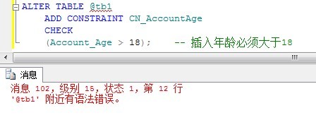 ALTER TABLE @tb1 ADD CONSTRAINT CN_AccountAge CHECK (Account_Age > 18); -- 插入年齡必須大于18