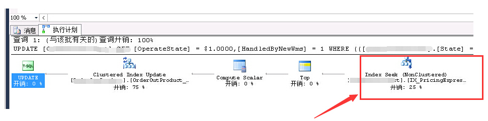 (@OperateState money,@HandledByNewWms bit,@State int,@OrderOut int)@HandledByNewWms=(1) @OperateState=($1.0000) @OrderOut=(4055484) @State=(3) UPDATE [Orderxxx] SET [OperateState] = $1.0000,[HandledByNewWms] = 1WHERE (([Orderxxx].[State] = 3) And ([Orderxxx].[OrderOut] = 4055484) And ([Orderxxx].[PricingExpressProductCode] IN ('UKRRM','UKRLE')))下圖為語句生成的執行計劃
