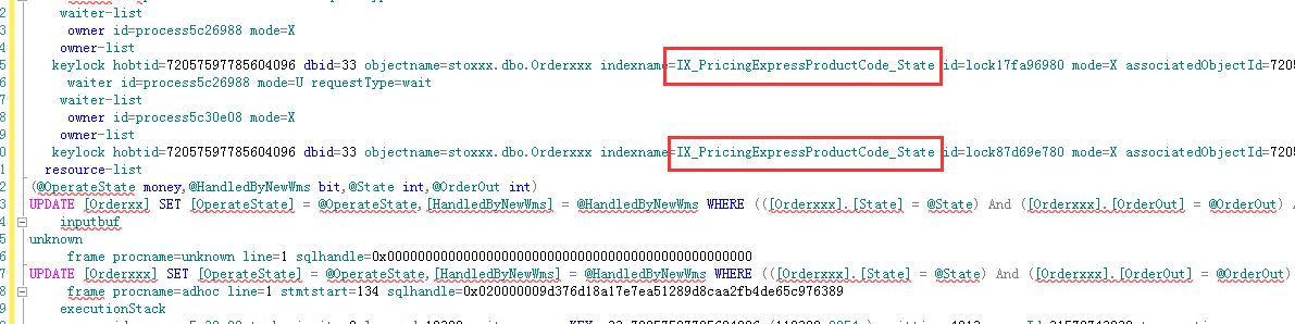 EXEC xp_readerrorlog 0,1,NULL,NULL,'2015-09-21','2015-10-10','DESC' waiter id=process5c30e08 mode=U requestType=wait waiter-list owner id=process5c26988 mode=X owner-list keylock hobtid=72057597785604096 dbid=33 objectname=stoxxx.dbo.Orderxxx indexname=IX_PricingExpressProductCode_State id=lock17fa96980 mode=X associatedObjectId=72057597785604096 waiter id=process5c26988 mode=U requestType=wait waiter-list owner id=process5c30e08 mode=X owner-list keylock hobtid=72057597785604096 dbid=33 objectname=stoxxx.dbo.Orderxxx indexname=IX_PricingExpressProductCode_State id=lock87d69e780 mode=X associatedObjectId=72057597785604096 resource-list(@OperateState money,@HandledByNewWms bit,@State int,@OrderOut int)UPDATE [Orderxx] SET [OperateState] = @OperateState,[HandledByNewWms] = @HandledByNewWms WHERE (([Orderxxx].[State] = @State) And ([Orderxxx].[OrderOut] = @OrderOut) And ([Orderxxx].[PricingExpressProductCode] IN ('UKNIR'))) inputbufunknown frame procname=unknown line=1 sqlhandle=0x000000000000000000000000000000000000000000000000UPDATE [Orderxxx] SET [OperateState] = @OperateState,[HandledByNewWms] = @HandledByNewWms WHERE (([Orderxxx].[State] = @State) And ([Orderxxx].[OrderOut] = @OrderOut) And ([Orderxxx].[PricingExpressProductCode] IN ('UKNIR'))) frame procname=adhoc line=1 stmtstart=134 sqlhandle=0x020000009d376d18a17e7ea51289d8caa2fb4de65c976389 executionStack process id=process5c30e08 taskpriority=0 logused=10320 waitresource=KEY: 33:72057597785604096 (112399c2054a) waittime=4813 ownerId=31578743038 transactionname=user_transaction lasttranstarted=2015-09-24T10:22:58.410 XDES=0x372e95950 lockMode=U schedulerid=17 kpid=8496 status=suspended spid=153 sbid=0 ecid=0 priority=0 trancount=2 lastbatchstarted=2015-09-24T10:22:58.540 lastbatchcompleted=2015-09-24T10:22:58.540 clientapp=.Net SqlClient Data Provider hostname=CK1-WIN-WEB02 hostpid=37992 loginname=ck1.biz isolationlevel=read committed (2) xactid=31578743038 currentdb=33 lockTimeout=4294967295 clientoption1=671088672 clientoption2=128056(@OperateState money,@HandledByNewWms bit,@State int,@OrderOut int)UPDATE [Orderxxx] SET [OperateState] = @OperateState,[HandledByNewWms] = @HandledByNewWms WHERE (([Orderxxx].[State] = @State) And ([Orderxxx].[OrderOut] = @OrderOut) And ([Orderxxx].[PricingExpressProductCode] IN ('UKNIR'))) inputbufunknown frame procname=unknown line=1 sqlhandle=0x000000000000000000000000000000000000000000000000UPDATE [Orderxxx] SET [OperateState] = @OperateState,[HandledByNewWms] = @HandledByNewWms WHERE (([Orderxxx].[State] = @State) And ([Orderxxx].[OrderOut] = @OrderOut) And ([Orderxxx].[PricingExpressProductCode] IN ('UKNIR'))) frame procname=adhoc line=1 stmtstart=134 sqlhandle=0x020000009d376d18a17e7ea51289d8caa2fb4de65c976389 executionStack process id=process5c26988 taskpriority=0 logused=9892 waitresource=KEY: 33:72057597785604096 (70f5b089bb2b) waittime=4813 ownerId=31579268946 transactionname=user_transaction lasttranstarted=2015-09-24T10:27:01.357 XDES=0x98312f950 lockMode=U schedulerid=16 kpid=9184 status=suspended spid=454 sbid=0 ecid=0 priority=0 trancount=2 lastbatchstarted=2015-09-24T10:27:01.490 lastbatchcompleted=2015-09-24T10:27:01.487 clientapp=.Net SqlClient Data Provider hostname=CK1-WIN-WEB02 hostpid=37992 loginname=ck1.biz isolationlevel=read committed (2) xactid=31579268946 currentdb=33 lockTimeout=4294967295 clientoption1=671088672 clientoption2=128056 process-list deadlock victim=process5c26988deadlock-list咋一看上面的錯誤信息,可以發現兩條相同的語句造成的死鎖,但是這么短的語句不可能持有排他鎖太久