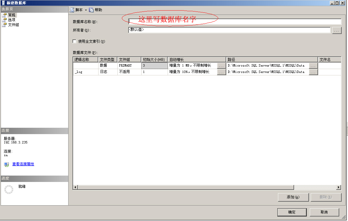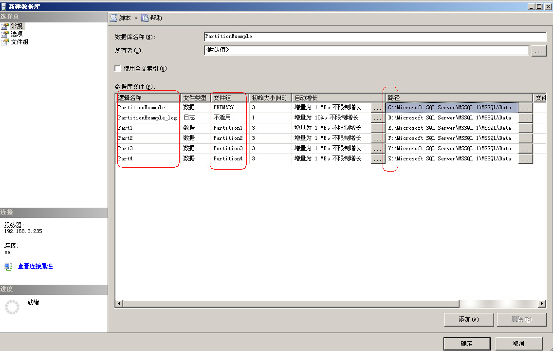 看到用紅色框框起來的地方?jīng)]?上一步中建立的文件組在這里就用上了。再看后面的路徑,我把每一個文件都單獨(dú)放在不同的磁盤上,而且最好都是單獨(dú)的放在不同的物理盤上,這樣會大大提高數(shù)據(jù)的性能。 點(diǎn)擊“確定”數(shù)據(jù)庫就算創(chuàng)建完成了。