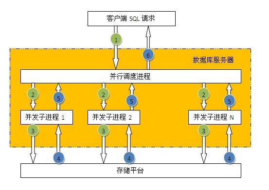 數據庫并行處理是指客戶端一條SQL的請求,數據庫內部自動分解成多個進程并行處理,如下圖所示: