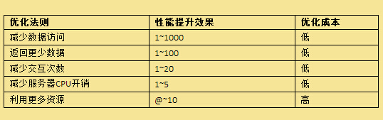根據當前計算機硬件的基本性能指標及其在數據庫中主要操作內容,可以整理出如下圖所示的性能基本優化法則: