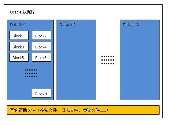 數據塊是數據庫中數據在磁盤中存儲的最小單位,也是一次IO訪問的最小單位,一個數據塊通常可以存儲多條記錄,數據塊大小是DBA在創建數據庫或表空間時指定,可指定為2K、4K、8K、16K或32K字節。下圖是一個Oracle數據庫典型的物理結構,一個數據庫可以包括多個數據文件,一個數據文件內又包含多個數據塊;