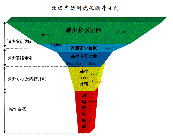 由于每一層優化法則都是解決其對應硬件的性能問題,所以帶來的性能提升比例也不一樣。傳統數據庫系統設計是也是盡可能對低速設備提供優化方法,因此針對低速設備問題的可優化手段也更多,優化成本也更低。我們任何一個SQL的性能優化都應該按這個規則由上到下來診斷問題并提出解決方案,而不應該首先想到的是增加資源解決問題。