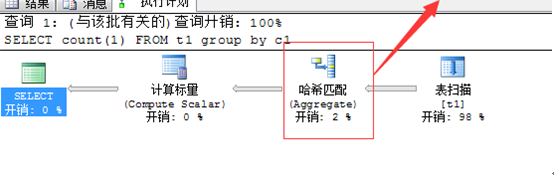 CREATE TABLE t1(c1 INT, c2 VARCHAR (8000)); GO DECLARE @a INT; SELECT @a = 1; WHILE (@a <= 5000) BEGIN INSERT INTO t1 VALUES (@a, replicate('a', 5000)) SELECT @a = @a + 1 END GO SELECT count(1) FROM t1 group by c1 哈希匹配: