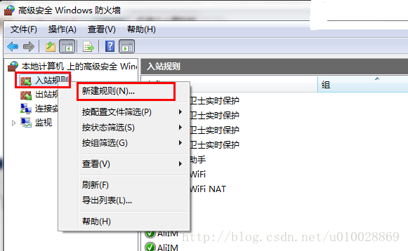 從上圖中我們可以看出,這臺SQL服務器上支持TCP/IP協議的是1433端口。下一步要做的是在防火墻的配置中允許1433端口支持TCP/IP協議即可。打開“控制面板”選擇“Windows防火墻”――“高級設置”。右擊“入站規則(Inboud Rules)”選項,選擇“新建規則(NewRule)”: