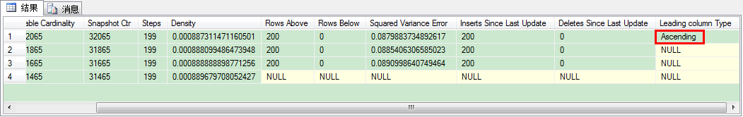 -- => 1st update the Statistics on the table with a FULLSCAN UPDATE STATISTICS Orders WITH FULLSCAN GO -- Insert 200 additional rows *after* the last step in the Histogram INSERT INTO Orders (OrderDate, Col2, Col3) VALUES ('20100201', 1, 1) GO 200 -- => 2nd update the Statistics on the table with a FULLSCAN UPDATE STATISTICS Orders WITH FULLSCAN GO -- Insert 200 additional rows *after* the last step in the Histogram INSERT INTO Orders (OrderDate, Col2, Col3) VALUES ('20100301', 1, 1) GO 200 -- => 3rd update the Statistics on the table with a FULLSCAN UPDATE STATISTICS Orders WITH FULLSCAN GO然后,當(dāng)我們執(zhí)行DBCC SHOW_STATISTICS命令,你會(huì)看到SQL Server已講那列標(biāo)記為Ascending。