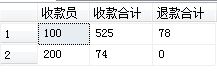with ta as(select '收' as 標記,'100' as 收款員,150 as 金額 union select '收','100',375 union select '退','100',78 union select '收','200',74)select 收款員,sum(case when 標記='收' then 金額 else 0 end) as 收款合計, sum(case when 標記='退' then 金額 else 0 end) as 退款合計 from ta group by 收款員