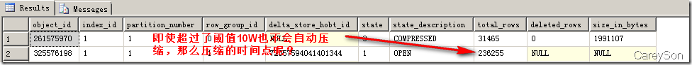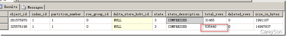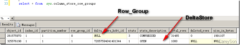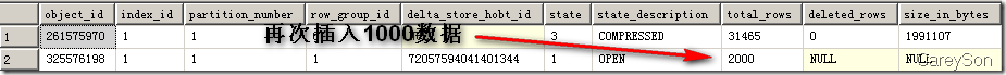 上述列存儲的兩部分我們可以通過2014新引入的DMV進行觀測,如圖3所示。在圖3中,我們隊目前已經存在31465行的聚集列索引插入了1000行新的數據,則SQL Server認為這部分數據不滿10W行,因此以Deltastore的方式存在。