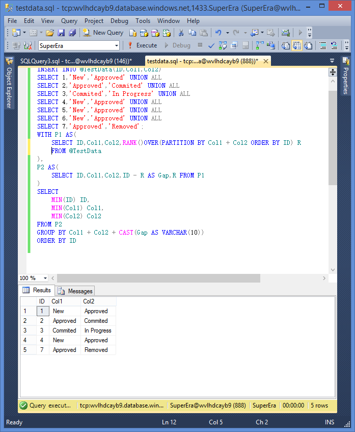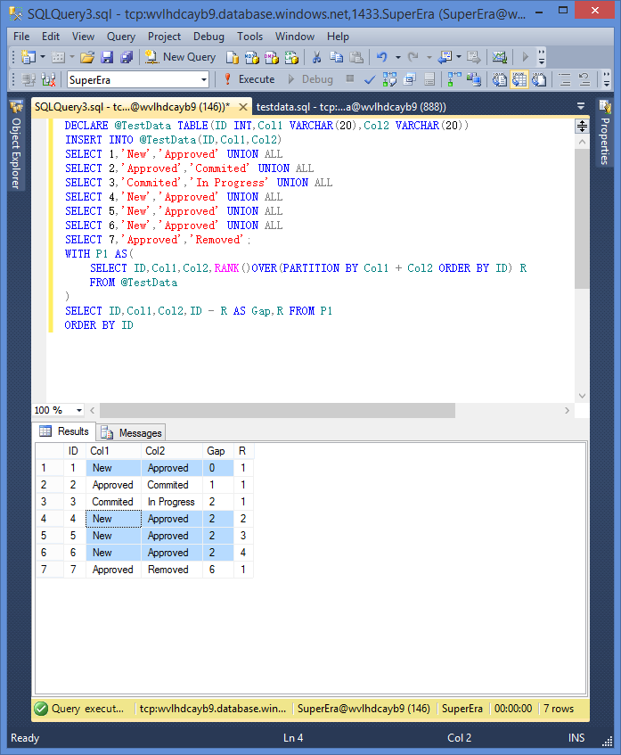 記錄4、5、6相同且連續出現,其ID與其排名在同時增長,其差值則保持不變,這里使用Col1 + Col2 + Gap作為分組條件即可將記錄4、5、6合并,再取個最小ID出來,問題解決,完整腳本如下: