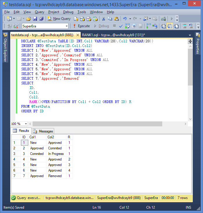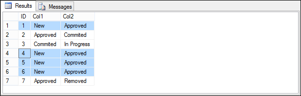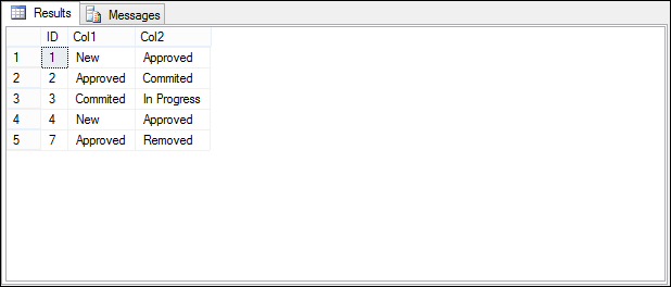 DECLARE @TestData TABLE(ID INT,Col1 VARCHAR(20),Col2 VARCHAR(20)) INSERT INTO @TestData(ID,Col1,Col2) SELECT 1,'New','Approved' UNION ALL SELECT 2,'Approved','Commited' UNION ALL SELECT 3,'Commited','In Progress' UNION ALL SELECT 4,'New','Approved' UNION ALL SELECT 5,'New','Approved' UNION ALL SELECT 6,'New','Approved' UNION ALL SELECT 7,'Approved','Removed' SELECT * FROM @TestData