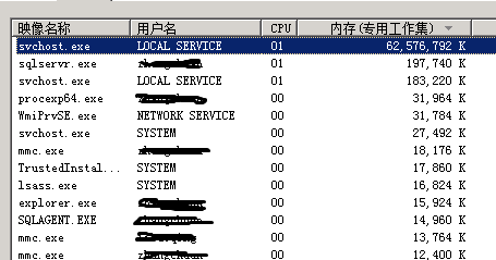 4、OK,既然這樣,是誰(shuí)占用了本該屬于我親愛(ài)的SQL Server的內(nèi)存呢?我們繼續(xù),打開(kāi)Wiindows任務(wù)管理,選定進(jìn)程選項(xiàng)卡,點(diǎn)擊顯示所有用戶進(jìn)程,發(fā)現(xiàn)svchost.exe占用了絕大多數(shù)的60G內(nèi)存!