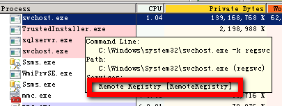 5、那svchost.exe又是個(gè)什么東西呢?我們下面就用到ProcessMonitor這個(gè)工具了,打開(kāi)后自動(dòng)加載所有Wiindows進(jìn)程,按內(nèi)存排序后,鼠標(biāo)移至svchost.exe進(jìn)程上,顯示為Remote Registry服務(wù)。