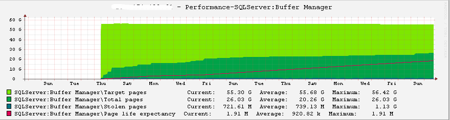 附一張內(nèi)存監(jiān)控圖,可以看到服務(wù)重啟之后,SQL Server的Total Pages一直在上升,并逐漸穩(wěn)定,Page life expectancy也在變得越來(lái)越大,CPU也能指示病癥已消除,我很欣慰。