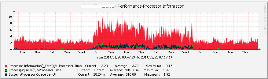 1、首先打開(kāi)Cacti監(jiān)控,發(fā)現(xiàn)最近CPU均值在某天之后驟然上升,并且可以看到System/Processor Queue Length 和 sqlservr/%ProcessorTime 也在顯著的變化。