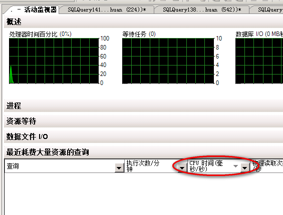 2、從最容易入手的低效SQL開(kāi)始,考慮是不是最近業(yè)務(wù)做了什么修改?連接到該SQL實(shí)例,打開(kāi)活動(dòng)監(jiān)視器,展開(kāi)“最近耗費(fèi)大量資源的查詢”,并CPU時(shí)間倒序,在這里并未發(fā)現(xiàn)有即時(shí)的耗費(fèi)資源的查詢。據(jù)個(gè)人經(jīng)驗(yàn),這里的值如果是4位數(shù),分鐘內(nèi)執(zhí)行次數(shù)3位數(shù),一般的服務(wù)器CPU大概就10%以上,如果cpu時(shí)間那里是5位數(shù),且分鐘內(nèi)執(zhí)行次數(shù)也很高,幾百次以上,那CPU一般就會(huì)不淡定了。圖片僅為演示