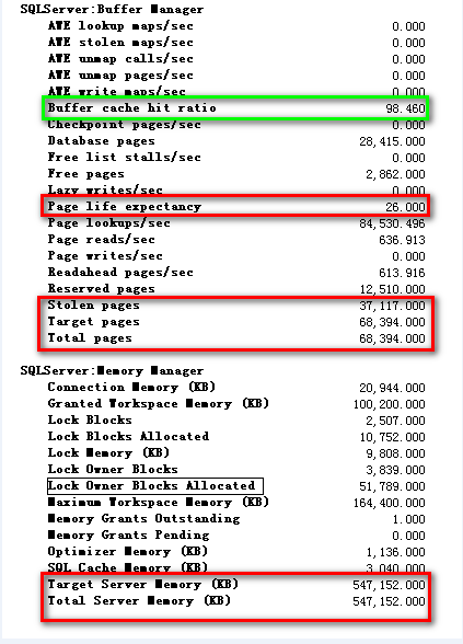 3、沒(méi)有耗資源的SQL,這是DBA最不愿意看到的結(jié)果,因?yàn)橐苍S,SQL Server受到了來(lái)自內(nèi)部或者外部的壓力,使得自己花費(fèi)了過(guò)多的時(shí)間去處理與操作系統(tǒng)的溝通去了。SQL Server常見(jiàn)的非查詢低效類的性能問(wèn)題,絕大多數(shù)都來(lái)自于內(nèi)存或者硬盤(pán),而這兩者有的時(shí)候需要同時(shí)研究對(duì)比基線,才能確定誰(shuí)是因,誰(shuí)是果。在這里,我們首先查看SQL Server內(nèi)存使用情況,當(dāng)打開(kāi)性能計(jì)數(shù)器時(shí),我和我的小伙伴們都驚呆了……安裝了64G內(nèi)存的數(shù)據(jù)庫(kù),SQL Server的TargetMemory僅有500多兆!這其中StolenPage還占用了200多兆,數(shù)據(jù)庫(kù)DataPage僅有200多兆的內(nèi)存可供使用,Oh,Shit!雖然我很不想用“去哪了”這三個(gè)字,但是“我的內(nèi)存去哪了“?同時(shí)我們也注意到PageLifeExpectancy值只有26(一個(gè)內(nèi)存充足的服務(wù)器,這個(gè)值至少應(yīng)該是上W的),而很早之前我們津津樂(lè)道的"Cache Hit Ration"卻仍然保持一個(gè)比較高的水準(zhǔn)98! 這個(gè)案例告訴我們,緩存命中率這個(gè)性能計(jì)數(shù)器很多時(shí)候說(shuō)明不了什么問(wèn)題。