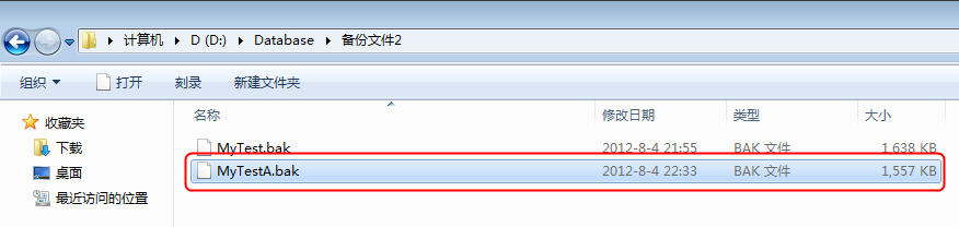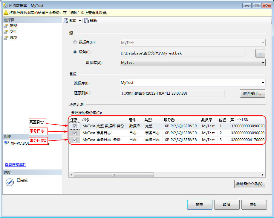 圖1-2:選擇備份文件“MyTest.bak”后,此時能看到“要還原的備份集”列表里顯示有備份文件,分別列出了完整備份文件和兩次事務日志備份。
