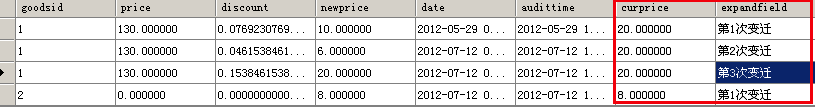 第二列是取該商品的最后變遷價格newPrice,然后將該值賦到這個商品的其他行中,例如對于goodsid為1的,最后一個newprice為20,那么對于所有g(shù)oodsid為1的記錄curprice都寫為20,從而達到外面控件分布的效果。