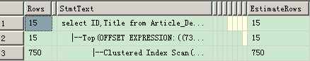 dbcc freeproccache dbcc dropcleanbuffers set statistics time on set statistics io on set statistics profile on; with #pager as ( select ID,Title,ROW_NUMBER() OVER(Order By ID) as rowid from Article_Detail ) select ID,Title from #pager where rowid between (15 * (50-1)+1) and 15 * 50 set statistics profile off;