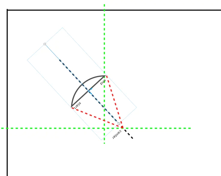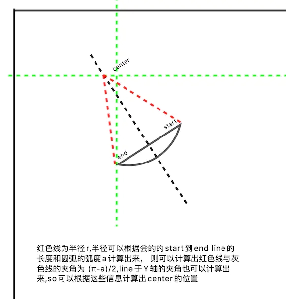其實(shí)我們可以通過(guò),兩個(gè)坐標(biāo)點(diǎn)(startPoint & endPoint),和兩點(diǎn)間的線段對(duì)應(yīng)的圓弧的弧度(angle/radian)就能確定這個(gè)圓的信息(半徑radius, center), 所以我們是不是可以封裝出只提供 start, end 和 angle 就能繪制 arc 的函數(shù)?
