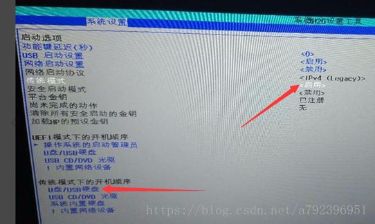 3. 在啟動選項里有一個“傳統模式”默認是禁用的,把它改成啟用,并且把“傳統模式下的開機順序”下面的“U盤/USB硬盤”通過鍵盤調到第一個,修改完成后記得按“F10”保存并退出。