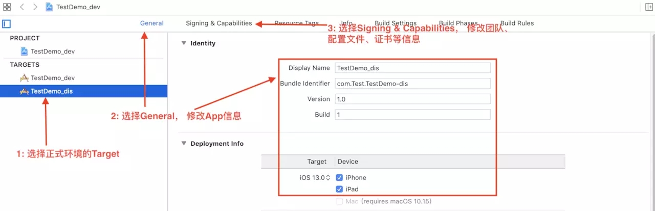 (2)更改正式環境下的General 和 Signing & Capabilities中的信息