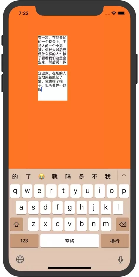 NSString *text = @"有一次,在我參加的一個晚會上,主持人問一個小男孩:你長大以后要做什么樣的人?孩子看看我們這些企業家,然后說:做企業家。在場的人忽地笑著鼓起了掌。我也拍了拍手,但聽著并不舒服。我想,這孩子對于企業究竟知道多少呢?他是不是因為當著我們的面才說要當企業家的呢?他是不是受了大人的影響,以為企業家風光,都是有錢的人,才要當企業家的呢/n這一切當然都是一個謎。但不管怎樣,作為一個人的人生志向,我以為當什么并不重要;不管是誰,最重要的是從小要立志做一個努力的人/n我小的時候也曾有人問過同樣的問題,我的回答不外乎當教師、解放軍和科學家之類。時光一晃流走了二十多年,當年的孩子,如今已是四十出頭的大人。但仔細想一想,當年我在大人們跟前表白過的志向,實際一個也沒有實現。我身邊的其他人差不多也是如此。有的想當教師,后來卻成了個體戶;想當解放軍的,有人竟做了囚犯。我上大學時有兩個同窗好友,他們現在都是我國電子行業里才華出眾的人,一個成長為“康佳”集團的老總,一個領導著TCL集團。我們三個不期而然地成為中國彩電骨干企業的經營者,可是當年大學畢業時,無論有多大的想像力,我們也不敢想十幾年后會成現在的樣子。一切都是我們在奮斗中見機行事,一步一步努力得來的。與其說我們是有理想的人,不如說我們是一直在努力的人。/n并非我們不重視理想,而是因為樹雄心壯志易,為理想努力難,人生自古就如此。有誰會想到,十多年前的今天,我曾是一個在街頭彷徨,為生存犯愁的人?當時的我,一無所有,前途渺茫,真不知路在何處。然而,我卻沒有灰心失望,回想起來,支撐著我走過這段坎坷歲月的正是我的意志品格。當許多人以為我已不行、該不行了的時候,我仍做著從地上爬起來的努力,我堅信人生就像馬拉多納踢球,往往是在快要倒下去的時候“進球”獲得生機的。事實也正是如此,就在“山重水復疑無路”的時候,香港一家企業倒閉給了我東山再起的機會,使我能夠與掌握世界最新技術的英國科技人員合作,開發技術先進的彩色電視機,從此一舉走出困境。/n有人說,“努力”與“擁有”是人生一左一右的兩道風景。但我以為,人生最美最不能遜色的風景應該是努力。努力是人生的一種精神狀態,是對生命的一種赤子之情。努力是擁有之母,擁有是努力之子。一心努力可謂條條大路通羅馬,只想獲取可謂道路逼仄,天地窄小。所以,與其規定自己一定要成為一個什么樣的人物,獲得什么東西,不如磨練自己做一個努力的人。志向再高,沒有努力,志向終難堅守;沒有遠大目標,因為努力,終會找到奮斗的方向。做一個努力的人,可以說是人生最切實際的目標,是人生最大的境界。/n許多人因為給自己定的目標太高太功利,因為難以成功而變得灰頭土臉,最終灰心失望。究其原因,往往就是因為太關注擁有,而忽略做一個努力的人。對于今天的孩子們,如果只關注他們將來該做個什么樣的人物,不把意志品質作為一個做人的目標提出來,最終我們只能培養出狹隘、自私、脆弱和境界不高的人。遺憾的是,我們在這方面做得并不盡如人意。"; while (text.length > 0) { // 添加文本視圖展示,并獲得剩余文本 text = [self addTextViewWithText:text originY:originY]; }- (NSString *)addTextViewWithText:(NSString *)text originY:(CGFloat)originY { UITextView *textView = [[UITextView alloc] initWithFrame:CGRectMake(0, originY, kTextViewSize.width, kTextViewSize.height)]; ...... ...... ...... // 獲取文本視圖可容納文本范圍 NSRange textRange = [textView.layoutManager glyphRangeForTextContainer:textView.textContainer]; NSString *textViewText = [text substringWithRange:textRange]; textView.text = textViewText; [self.scView addSubview:textView]; // 獲取容納不了的剩余文本 NSString *remainText = [text substringFromIndex:NSMaxRange(textRange)]; return remainText;}效果展示