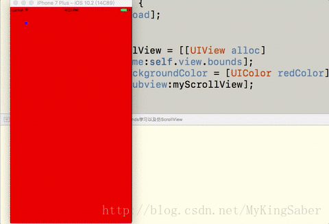 - (void)viewDidLoad { [super viewDidLoad]; // 仿scrollView UIView *myScrollView = [[UIView alloc] initWithFrame:self.view.bounds]; myScrollView.backgroundColor = [UIColor redColor]; [self.view addSubview:myScrollView]; // 滑動手勢 UIPanGestureRecognizer *pan = [[UIPanGestureRecognizer alloc] initWithTarget:self action:@selector(panGes:)]; [myScrollView addGestureRecognizer:pan]; // scrollView的內(nèi)容 UIView *blueView = [[UIView alloc] initWithFrame:CGRectMake(50, 50, 10, 10)]; blueView.backgroundColor = [UIColor blueColor]; [myScrollView addSubview:blueView];}- (void)panGes:(UIPanGestureRecognizer *)gesture{ UIView *myScrollView = gesture.view; // 獲取滑動的位移量 CGPoint transPoint = [gesture translationInView:myScrollView]; NSLog(@"%@",NSStringFromCGPoint(transPoint)); // 這里總感覺寫錯了,我腦子笨,有點繞不過來了。頭疼 CGRect bounds = myScrollView.bounds; bounds.origin.x -= transPoint.x; bounds.origin.y -= transPoint.y; myScrollView.bounds = bounds; // 復(fù)位 [gesture setTranslation:CGPointZero inView:myScrollView];}以上就是本文的全部內(nèi)容,希望對大家的學(xué)習(xí)有所幫助,也希望大家多多支持武林網(wǎng)。