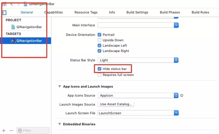 整個項目隱藏在Targets -> General -> 勾選 Hide status bar 即可。