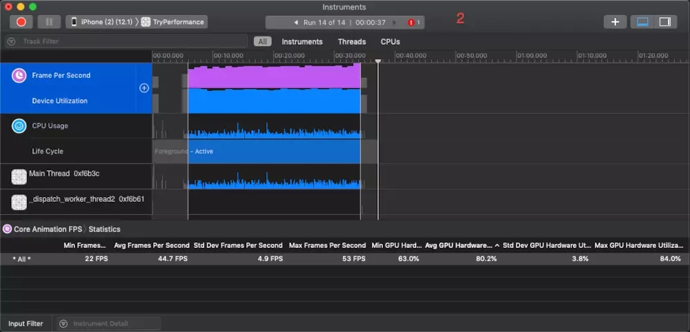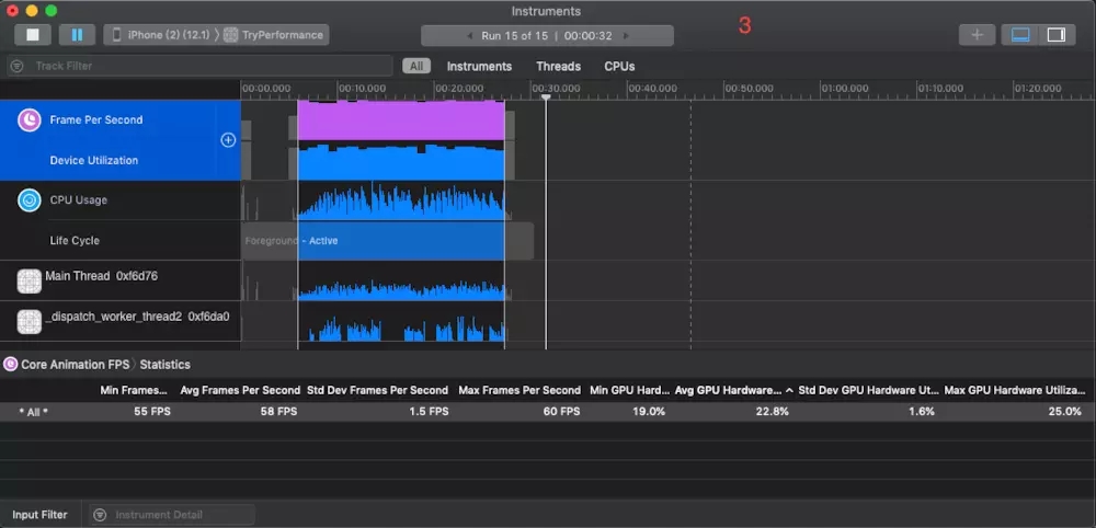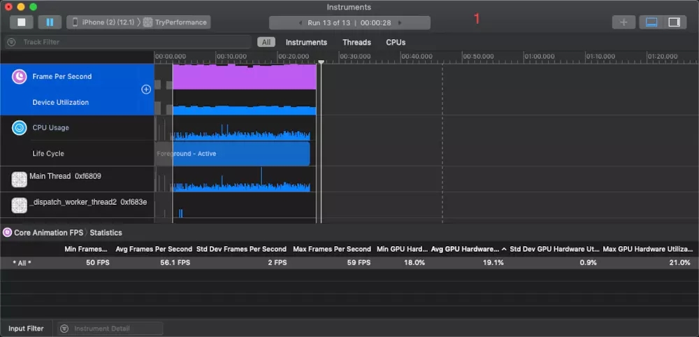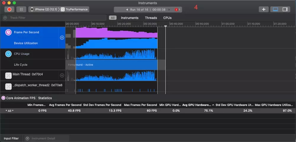 為了驗(yàn)證網(wǎng)上的結(jié)論,需要找一種性能比較的方法,這里用 Instrument 的測(cè)試 FPS (幀數(shù))作為性能直觀的比較值,測(cè)試過(guò)程如下: