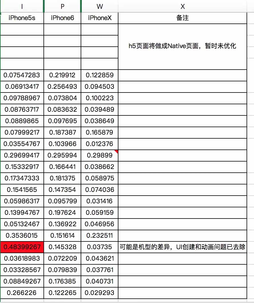 為了弄明白,到底是什么原因讓我們的App,頁面加載速度相對來說比較慢,我們對頁面的UI進(jìn)行優(yōu)化,數(shù)據(jù)也進(jìn)行了異步加載,我們hook數(shù)據(jù)一看,頁面的加載速度果然有所減少,但是減少的值大概只有0.03s,很明顯這個(gè)值不足以達(dá)到我們想要的效果,后來,通過寫了一些測試demo,針對空白頁面和有UI創(chuàng)建的頁面進(jìn)行各種對比后,似乎和我們頁面加載過程中的push動畫有很大的關(guān)系;下面所做的實(shí)驗(yàn)主要是為了驗(yàn)證這個(gè)問題,針對這個(gè)問題,我選取了我們工程的一個(gè)類,對有push進(jìn)入到這個(gè)頁面有過場動畫和沒有動畫進(jìn)行測試,以下數(shù)據(jù)是測試結(jié)果: