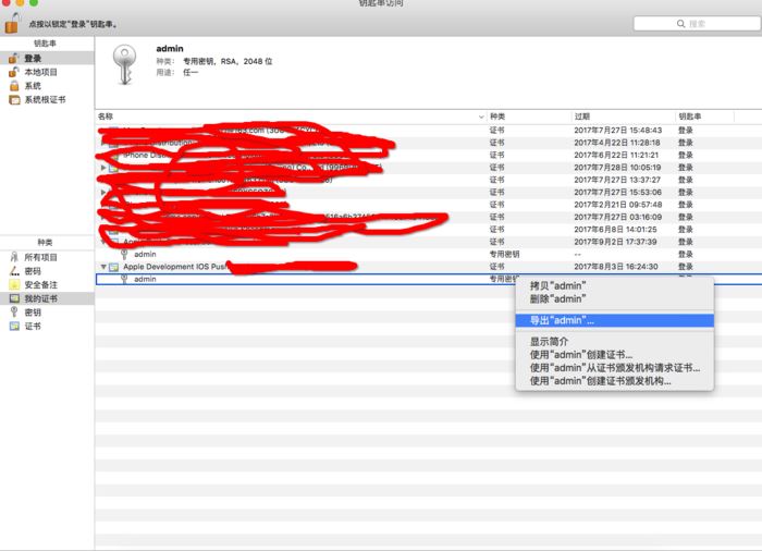 2.2、生成證書對應(yīng)的秘鑰apns-dev-key.p12的p12文件,按照下面操作導(dǎo)出p12,桌面對應(yīng)生成apns-dev-ker.p12文件。