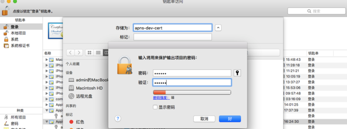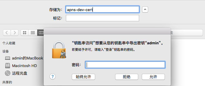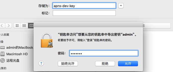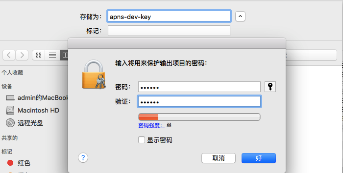 此處要求驗(yàn)證保護(hù)密碼,再一次輸入123456,此時(shí)桌面會(huì)生成一個(gè)apns-dev-key.pem文件