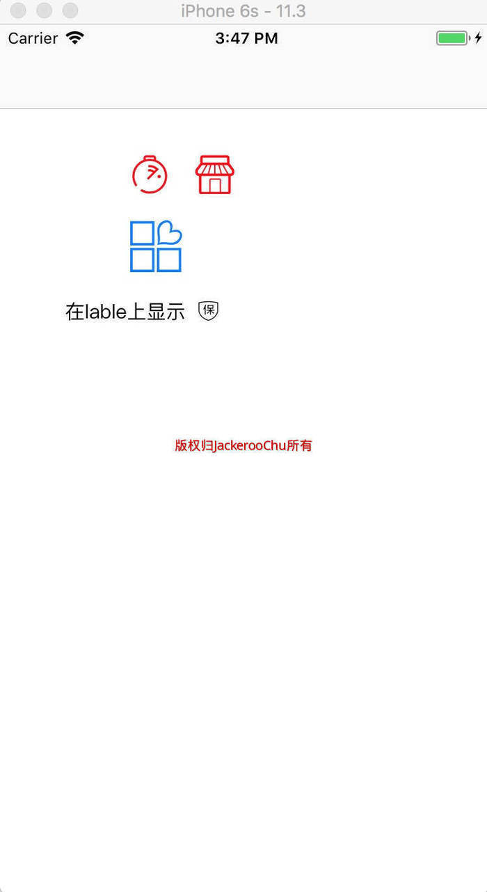 #import "ViewController.h"#import "TBCityIconFont.h"#import "UIImage+TBCityIconFont.h"@interface ViewController ()@end@implementation ViewController- (void)viewDidLoad { [super viewDidLoad]; self.view.backgroundColor = [UIColor whiteColor]; UIImageView *imageView = [[UIImageView alloc] initWithFrame:CGRectMake(100, 100, 30, 30)]; [self.view addSubview:imageView]; //圖標編碼是,需要轉(zhuǎn)成/U0000e600 imageView.image = [UIImage iconWithInfo:TBCityIconInfoMake(@"/U0000e600", 30, [UIColor redColor])]; // button UIButton *button = [UIButton buttonWithType:UIButtonTypeSystem]; button.frame = CGRectMake(100, 150, 40, 40); [self.view addSubview:button]; [button setImage:[UIImage iconWithInfo:TBCityIconInfoMake(@"/U0000e614", 40, [UIColor redColor])] forState:UIControlStateNormal]; // label,label可以將文字與圖標結(jié)合一起,直接用label的text屬性將圖標顯示出來 UILabel *label = [[UILabel alloc] initWithFrame:CGRectMake(50, 200, 280, 40)]; [self.view addSubview:label]; label.font = [UIFont fontWithName:@"iconfont" size:15];//設(shè)置label的字體 label.text = @"在lable上顯示 /U0000e658"; // Do any additional setup after loading the view, typically from a nib.}- (void)didReceiveMemoryWarning { [super didReceiveMemoryWarning]; // Dispose of any resources that can be recreated.}@end結(jié)果如下圖所示: