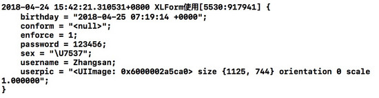 5.如何獲取設置好的表單的值?其實非常簡單,該框架提供一個方法formValues,它的返回類型是一個NSDictionary,其中key就是XLFormRowDescriptor設置時的Tag。可以直接在控制器中調用該方法獲取表單值,上面的效果圖設置后的表單信息如下: