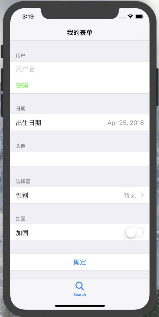 - (void)initializeForm { // 設置是否顯示Cell之間分界線 //self.tableView.separatorStyle = UITableViewCellSeparatorStyleNone; // 設置Section的高度 self.tableView.sectionHeaderHeight = 30; XLFormDescriptor * form;//form,一個表單只有一個 XLFormSectionDescriptor * section;//section,一個表單可能有多個 XLFormRowDescriptor * row; //row,每個section可能有多個row // Form form = [XLFormDescriptor formDescriptor]; // First section section = [XLFormSectionDescriptor formSection]; section.title = @"用戶"; [form addFormSection:section]; // 普通文本 row = [XLFormRowDescriptor formRowDescriptorWithTag:@"username" rowType:XLFormRowDescriptorTypeText]; // 設置placeholder [row.cellConfig setObject:@"用戶名" forKey:@"textField.placeholder"]; // 設置文本顏色 [row.cellConfig setObject:[UIColor redColor] forKey:@"textField.textColor"]; [section addFormRow:row]; // 密碼 row = [XLFormRowDescriptor formRowDescriptorWithTag:@"password" rowType:XLFormRowDescriptorTypePassword]; // 設置placeholder的顏色 NSAttributedString *attrString = [[NSAttributedString alloc] initWithString:@"密碼" attributes: @{NSForegroundColorAttributeName:[UIColor greenColor], }]; [row.cellConfig setObject:attrString forKey:@"textField.attributedPlaceholder"]; [section addFormRow:row]; // Second Section section = [XLFormSectionDescriptor formSection]; section.title = @"日期"; [form addFormSection:section]; // 日期選擇器 row = [XLFormRowDescriptor formRowDescriptorWithTag:@"birthday" rowType:XLFormRowDescriptorTypeDate title:@"出生日期"]; row.value = [NSDate dateWithTimeIntervalSinceNow:60*60*24]; [section addFormRow:row]; // Third Section section = [XLFormSectionDescriptor formSection]; section.title = @"頭像"; [form addFormSection:section]; // 圖片選擇 row = [XLFormRowDescriptor formRowDescriptorWithTag:@"userpic" rowType:XLFormRowDescriptorTypeImage]; [section addFormRow:row]; // Fourth Section section = [XLFormSectionDescriptor formSection]; section.title = @"選擇器"; [form addFormSection:section]; // 選擇器 row = [XLFormRowDescriptor formRowDescriptorWithTag:@"sex" rowType:XLFormRowDescriptorTypeSelectorPush]; row.noValueDisplayText = @"暫無"; row.selectorTitle = @"性別選擇"; row.selectorOptions = @[@"男",@"女",@"其他"]; row.title = @"性別"; [row.cellConfigForSelector setObject:[UIColor redColor] forKey:@"textLabel.textColor"]; [row.cellConfigForSelector setObject:[UIColor greenColor] forKey:@"detailTextLabel.textColor"]; [section addFormRow:row]; // Fifth Section section = [XLFormSectionDescriptor formSection]; section.title = @"加固"; [form addFormSection:section]; // 開關 row = [XLFormRowDescriptor formRowDescriptorWithTag:@"enforce" rowType:XLFormRowDescriptorTypeBooleanSwitch title:@"加固"]; [section addFormRow:row]; // Sixth Section section = [XLFormSectionDescriptor formSection]; [form addFormSection:section]; // 按鈕 row = [XLFormRowDescriptor formRowDescriptorWithTag:@"conform" rowType:XLFormRowDescriptorTypeButton]; row.title = @"確定"; [section addFormRow:row]; self.form = form;}-(void)didSelectFormRow:(XLFormRowDescriptor *)formRow{ // 判斷是不是點擊了確定按鈕 if([formRow.tag isEqualToString:@"conform"] && formRow.rowType == XLFormRowDescriptorTypeButton){ //獲取表單所有到的值 NSDictionary *values = [self formValues]; NSLog(@"%@", values); } [super didSelectFormRow:formRow];}//重寫改該方法 上面的方法就不會調用了//-(void)tableView:(UITableView *)tableView didSelectRowAtIndexPath:(NSIndexPath *)indexPath{//// NSLog(@"%s", __func__);////}@end四、效果圖
