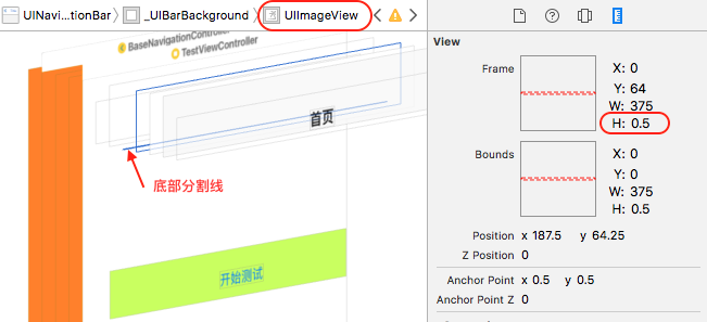 從圖中可以看出,導航欄的底部分割線是一個UIImageView對象,而且高度只有0.5,所以我們可以據此獲取到導航欄的底部分割線對象,在一個視圖控制器中實現此需求,代碼如下: